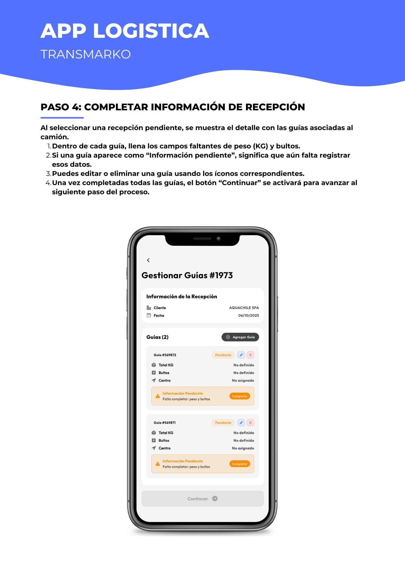 - Una vez completadas todas las guías, el botón "Continuar" se activará para avanzar al siguiente paso.