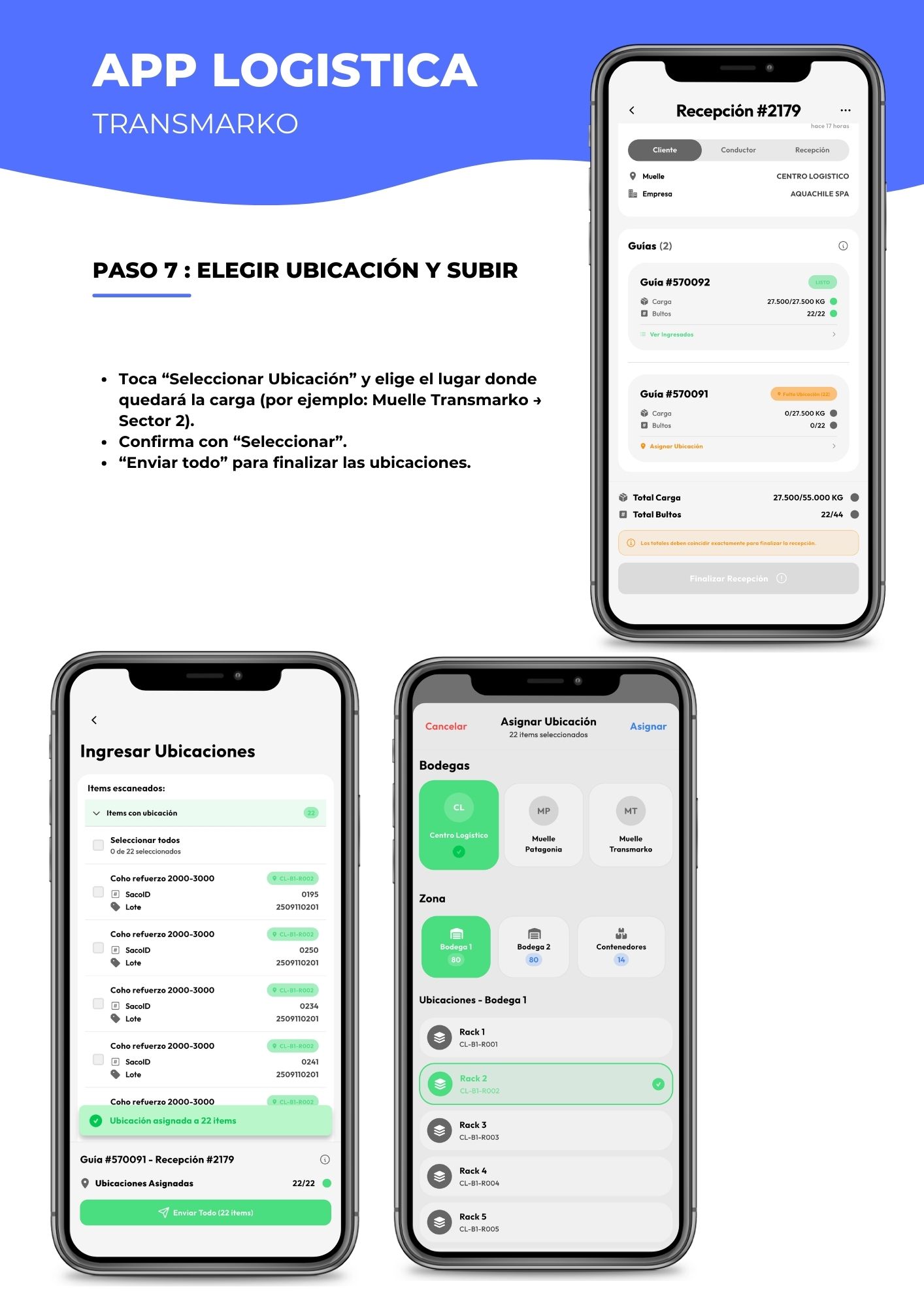 Toca "Seleccionar Ubicación" y elige el lugar donde quedará la carga (por ejemplo: Muelle Transmarko → Sector 2).