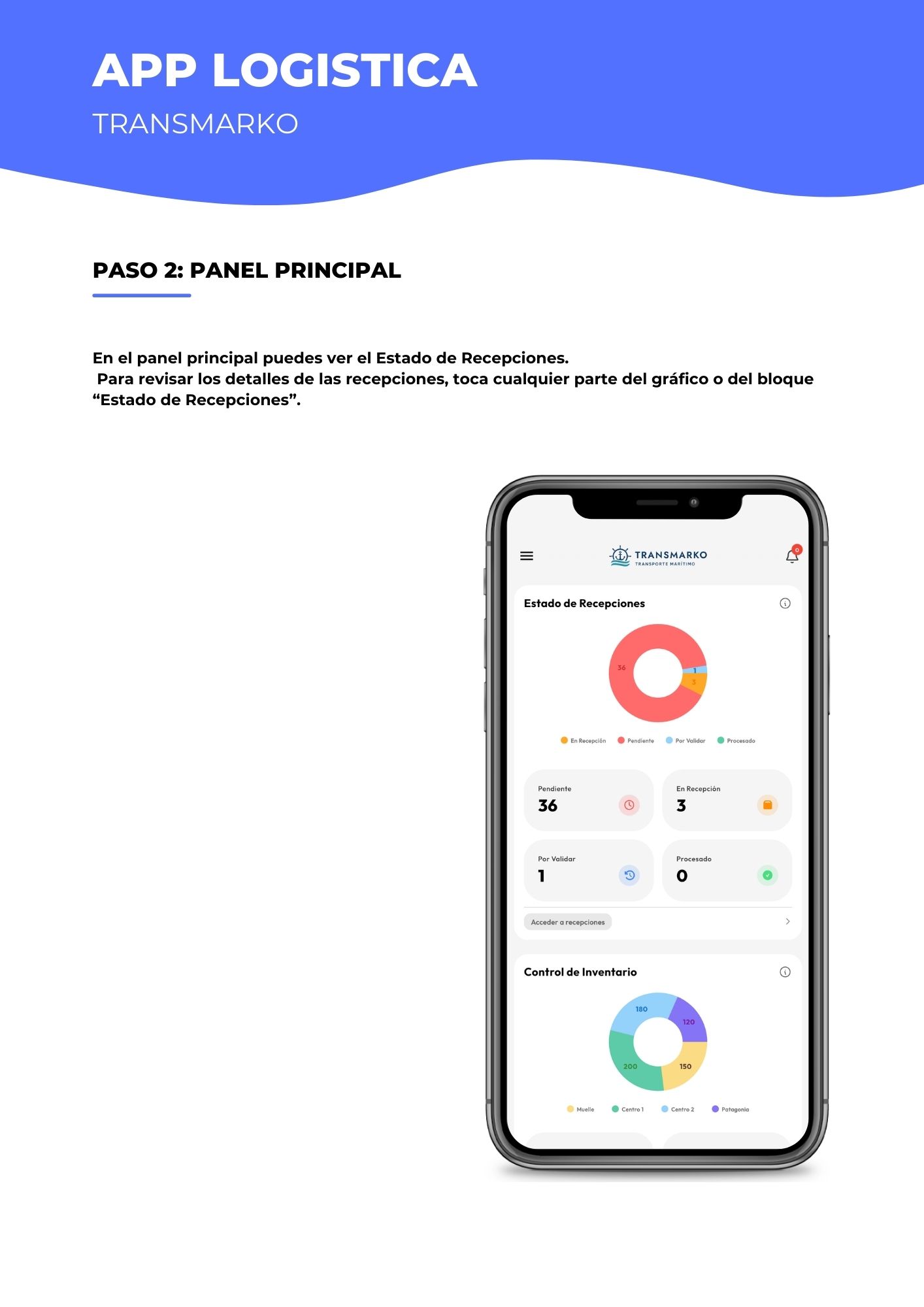 Al ingresar a la app, verás el panel principal con el bloque de Estado de Recepciones. Este resumen te muestra un vistazo rápido del estado actual de la operación.